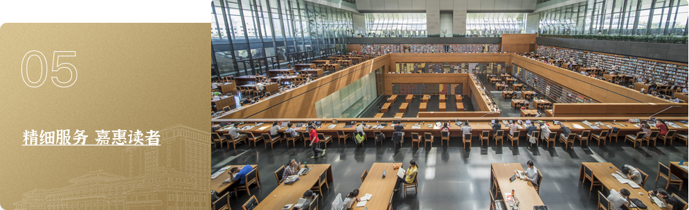 到馆读者服务。国家图书馆全年365天开馆,日均到馆读者1.2万人次。国家图书馆共有阅览室25个、阅览座位5000余个。馆舍功能布局各具特色,总馆南区主要提供外文文献、中外文专藏文献的专业性服务和国家典籍博物馆展陈服务;总馆北区提供以中文新出版文献借阅、电子文献、音视频资源服务为主的大众服务;古籍馆提供普通古籍、外文善本、旧地方志、家谱文献的研究性服务和临时主题展览服务。通过优化服务布局,形成“查、阅、咨、藏一体化”的现代化服务新格局;设置自助办证机、自助借还机、自助复印机,实现读者自助服务;馆内无线网络全覆盖,方便读者随时访问下载数字资源;为读者提供咖啡厅和餐厅等休闲辅助设施,满足读者多样化需求。